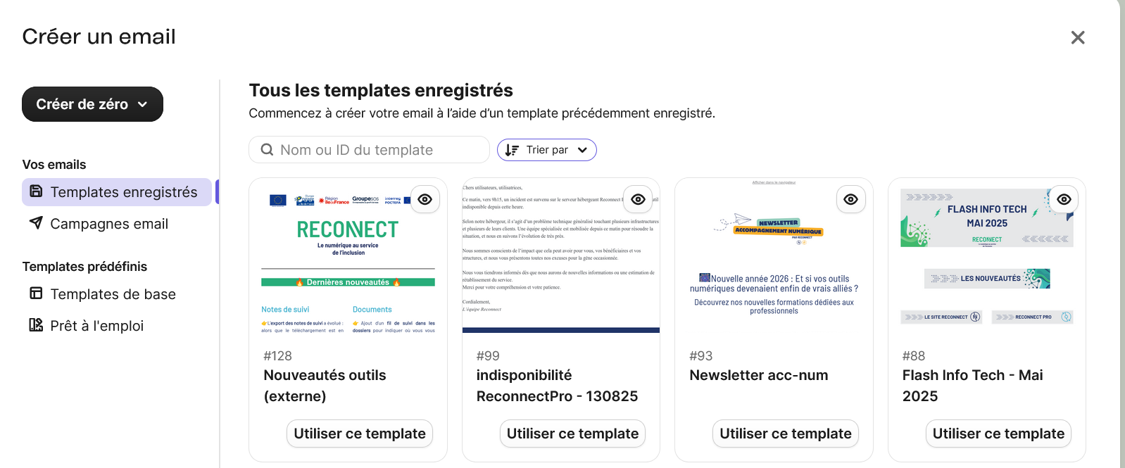 - Nom de la campagne : "Indisponibilité Reconnect Pro" ou "Indisponibilité Coffre-fort numérique Reconnect"